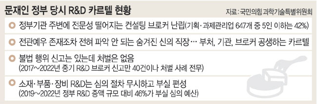 문재인 정부 당시 연구·개발(R&D) 목적의 국가 예산이 ‘이권 카르텔’에 의해 제대로 된 심의 없이 집행되거나 정부기관 주변에 컨설팅이란 이름으로 난립한 브로커들에게 줄줄 샜던 것으로 파악됐다. 문 정부 3년간(회계연도 2020~2022년) 전문가 심의 없이 늘어난 R&D 예산만 4조3000억 원 규모인데, 같은 기간 R&D 전체 증액 예산(약 9조3000억 원)의 46%에 해당한다.