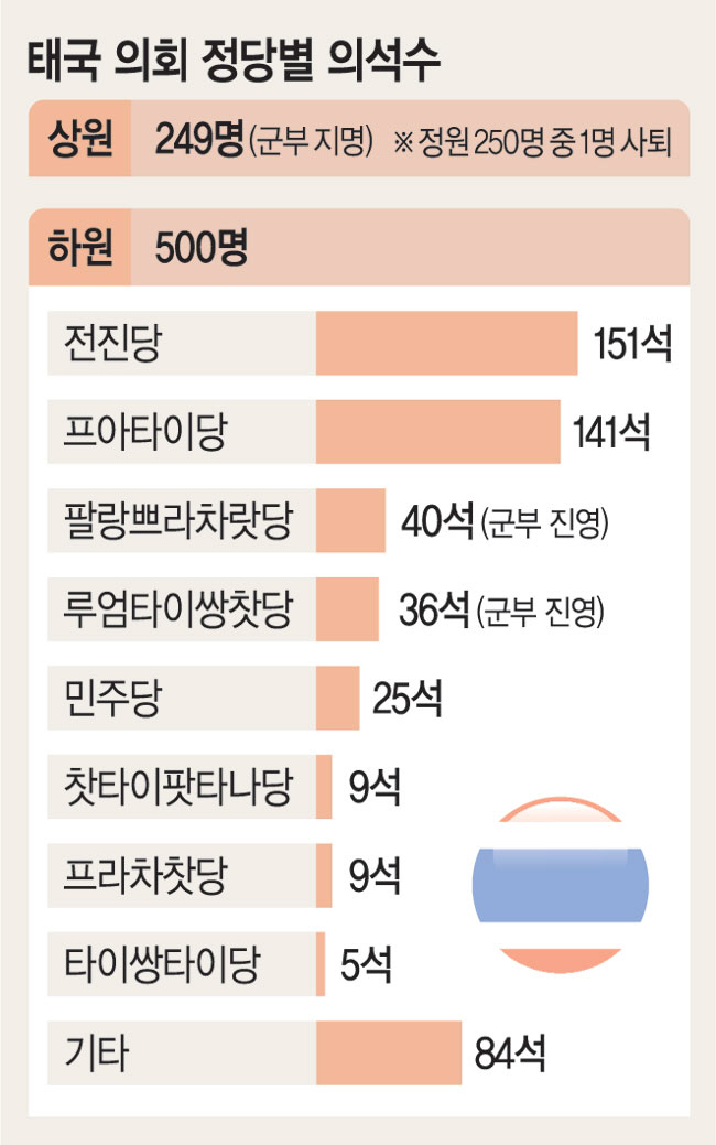 ◇20년 견원지간이 함께 만든 정권 = 탁신 전 총리의 측근인 부동산 재벌 출신인 세타 의원은 22일 제30대 태국 총리로 선출됐다. 이날 치러진 태국 상·하원 합동 총리 선출 투표에서 세타 총리는 프아타이당이 결성한 정당 연합의 단독 후보로 지명돼 과반 득표에 성공했다. 세타 총리는 정치인이 되기 전부터 탁신 전 총리를 지지하며 가깝게 지내온 측근으로 알려졌다. 프아타이당은 5월 총선에서 1당에 오른 전진당 중심의 민주 진영 야권 연합에 참여해 왔다. 하지만 총리에 도전한 피타 대표가 군부의 반대로 발목이 잡히자 프아타이당은 정부 구성권을 넘겨받은 뒤 전진당을 배제하고 왕실모독죄를 개정하지 않는 조건으로 군부 정당을 포함한 보수 세력과 손잡았다. 총리 선거 날 탁신 전 총리는 15년간의 해외 도피 생활을 마치고 전용기를 타고 자진 귀국했다. 그는 집권 중 각종 포퓰리즘 정책을 추진하고 군부에 반대하는 입장을 고수하면서 많은 지지를 받아왔다. 그는 2006년 군부 쿠데타로 실각한 뒤 전 미얀마 차관 불법 승인, 통신사 주식 불법 보유 등 4건의 부정부패 혐의로 징역 12년을 선고받으며 2008년부터 아랍에미리트, 두바이 등에서 망명 생활을 해 왔다. 형기가 10년이나 남아 있는 그가 전격 귀국한 건, 태국 군부와 사면을 놓고 물밑 타협 작업을 끝냈기 때문이라는 분석이 우세하다. 방콕포스트는 “탁신 전 총리는 즉시 왕실의 사면을 요청할 것이며 (사면에 대한) 확신이 없다면 귀국하지 않을 것이다”라고 했다. 그의 변심에 일각에서는 ‘탁신의 몸은 돌아왔지만, 혼은 돌아오지 않았다’는 비판의 목소리도 나온다.