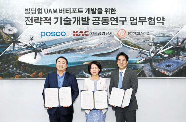 포스코는 한국공항공사, 한화 건설부문과 ‘빌딩형 UAM 버티포트 개발을 위한 전략적 기술개발 공동연구 업무협약’을 체결했다고 24일 밝혔다.