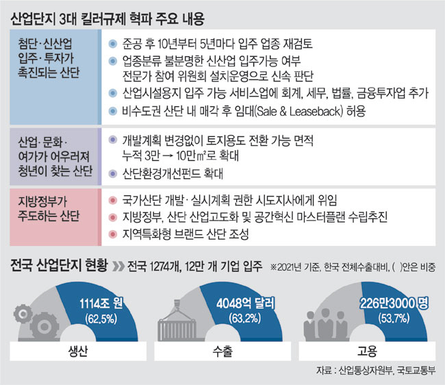 국내 산업단지가 24일 윤석열 정부가 발표한 ‘산업단지 입지 킬러규제 혁파방안’으로 경쟁력을 다시 확보하게 될 것으로 기대되면서 앞으로 기업이 투자하고 청년이 찾는 ‘산업캠퍼스’로 탈바꿈할 전망이다. 정부가 제조업 쏠림·노후화·편의시설 부족으로 대표되는 ‘산단 3대 문제’를 ‘킬러규제’ 때문으로 판단, 입주업종·토지용도·매매임대 제한 등 3대 규제를 파격적으로 완화하기로 했기 때문이다. 덕분에 서비스 및 첨단산업 기업의 입주가 쉬워지게 되면서 30년 된 노후화 산단에 새로운 활력을 불러일으킬 것으로 보인다.