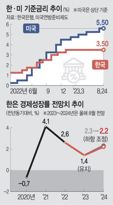한국은행이 갈수록 높아지고 있는 중국발 경기 불안 우려를 반영해 내년 경제 성장률 전망치를 2.2%로 0.1%포인트 하향 조정했다. 다만 올해 연간 국내총생산(GDP)이 1.4% 성장할 것이라는 전망은 유지했다. 미국 긴축 장기화와 중국 부동산 부실로 금융시장이 요동치고 있지만 실물 경제에 미치는 파장은 불확실한 상황에서 신중한 입장을 취한 것으로 풀이된다. 기준금리는 3.5% 수준을 유지하며 5회 연속 동결을 결정했다.