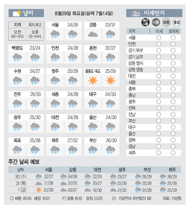 [날씨이야기] 8월29일 화요일(음력 7월14일)