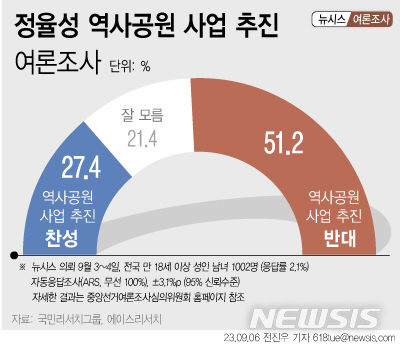 뉴시스가 여론조사 전문기관 국민리서치그룹과 에이스리서치에 의뢰해 지난 3~4일 2일 간 전국 만 18세 이상 성인 남녀 1002명을 대상으로 조사한 결과에 따르면 응답자의 51.2%가 역사공원 추진 사업을 반대한다고 밝혔다.