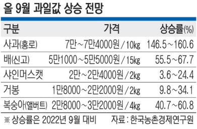 이 같은 과일 가격 상승은 생산량 감소에 따른 것이다. 연구원은 “사과, 배, 포도, 복숭아 등 주요 과일은 봄철 저온 피해와 여름철 호우 등의 영향으로 작황이 부진했다”고 설명했다. 연구원은 올해 사과 생산량은 작년과 비교해 21% 감소하고, 배 생산량은 20% 줄어든다고 예측했다. 농림축산식품부도 전날 “9월 농축산물 수급 상황은 전반적으로 안정세를 유지할 것으로 전망된다”면서도 “봄철 저온·서리 피해가 발생한 사과·배는 상품(上品)을 중심으로 가격이 높을 것”이라고 내다봤다.