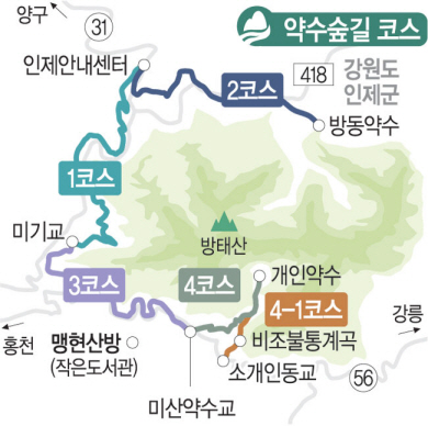 북부지방산림청이 지금까지 놓은 약수숲길 4개 코스를 모두 더 하면 45㎞ 남짓. 하지만 길의 완공은 아직 멀었다. 산림청은 앞으로 약수숲길의 총연장 거리를 250㎞까지 확대할 예정이다. 지금까지 놓은 길의 다섯 배가 넘는 거리다. 인제와 홍천의 내로라하는 약수는 물론이고, 오지 중의 오지로 꼽히는 삼둔사거리까지 다 이어붙인 길을 걸을 수 있다는 생각 만으로도 가슴이 두근거린다.