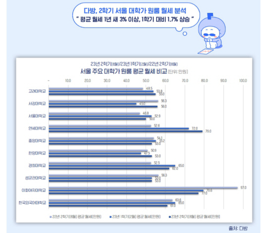 올해 1학기 개강 시즌인 2월 평균 월세와 비교했을 때 가장 많이 오른 곳은 서강대 인근 지역으로, 올해 2월 45만 원에서 56만 원으로 24.44% 상승했다. 이어 한양대 인근 지역의 평균 월세는 47.5만 원에서 53만 원으로 11.58%, 연세대 인근 지역 평균 월세는 72만 원에서 79만 원으로 9.72% 상승했으며, 고려대 인근 지역 평균 월세는 53만8000원에서 55만 원으로 2.23% 오르며 뒤를 이었다.