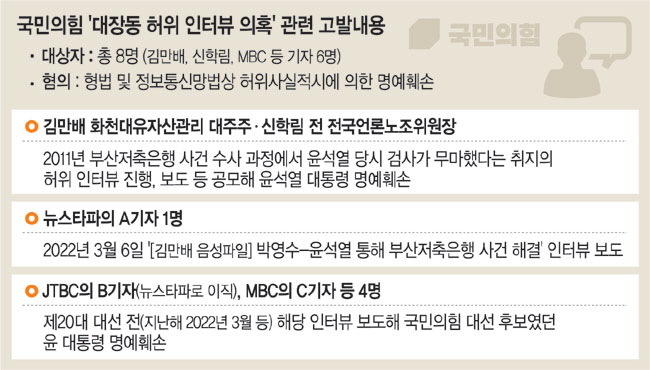 국민의힘은 7일 화천대유 대주주인 김만배 씨와 신학림 전 전국언론노조위원장의 이른바 ‘허위 인터뷰’ 논란을 둘러싸고 이재명 더불어민주당 대표와의 연관성에 대한 의혹을 집중 제기하며 공세를 펼쳤다. 지난해 제20대 대통령 선거 때 민주당 대선 후보였던 이 대표가 당시 뉴스타파의 인터뷰 보도 이후 1시간 만에 자신의 SNS에 “적반하장 후안무치”라며 기사를 공유하면서 적극 행동에 나선 점, 이 대표의 페이스북에서 지난해 대선 기간에 올라온 게시물 일부가 삭제된 점 등에 주목해 인터뷰 보도 전 이 대표와 사전 공모가 있었을 가능성에도 무게를 싣는 분위기다.