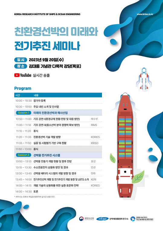 세미나는 1·2세션으로 나눠 진행된다. 1세션에서는 ‘미래의 친환경선박과 해사산업’을 주제로 기조강연과 발표가 진행되며, 2세션에서는 ‘선박용 전기추진 시스템’을 주제로 전문가 발표와 토론이 이루어질 예정이다.