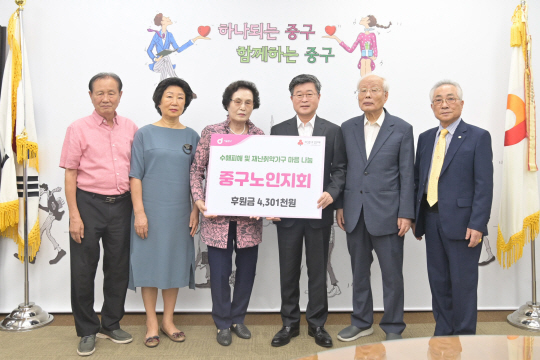 소화지(사진 왼쪽 세번째) 중구노인지회 회장은 "지난 7월 갑작스러운 집중호우로 어려움을 겪는 분에게 조금이나마 도움이 되고자 성금을 모았다"며 "피해 입은 주민들이 다시 편안한 일상으로 복귀할 수 있길 바란다"고 전했다.
