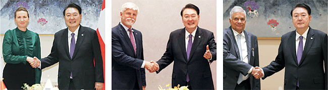 윤 대통령은 또 에바리스트 은다이시몌 부룬디 대통령과 1991년 수교 이래 처음으로 정상회담을 가졌다. 이어 페트르 파벨 체코 대통령과 정상회담을 열고 “앞으로 한반도, 우크라이나 등 국제 문제에서도 협력 확대를 기대한다”고 인사했다. 아울러 윤 대통령은 메테 프레데릭센 덴마크 총리와 만나 “양국이 2011년부터 매년 녹색성장 동맹회의를 개최하고, 그동안 녹색 전환 분야에서 긴밀하게 협력해왔다”고 평가했다. 한국과 덴마크 관계는 지난 2021년 5월 ‘포괄적 녹색 전략적 동반자관계’로 격상된 바 있다. 윤 대통령은 몬테네그로, 투르크메니스탄, 세인트루시아와도 잇달아 정상회담을 가졌다. 김 수석은 “윤 대통령에게는 외교가 경제이고 경제가 외교”라며 “대통령의 이번 순방은 경제 총력전의 의미도 있다”고 했다.