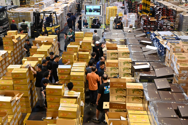 올여름 폭우와 폭염 등 이상기후 여파로 추석을 앞두고 농산물 시세가 크게 뛰어오른 가운데 20일 서울 송파구 가락동 농수산물도매시장에서 상인들이 경매받은 과일 상품을 살펴보고 있다.