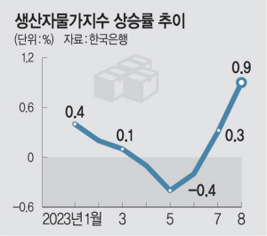 한국은행이 20일 발표한 8월 생산자물가지수는 121.16으로 7월보다 0.9% 상승했다. 지난해 4월(1.6%) 이후 상승 폭이 가장 컸으며, 7월에 이어 두 달 연속 올랐다. 8월 생산자물가지수는 1년 전과 비교해도 1.0% 높았다. 생산자물가는 전년 동월 대비로는 6월(-0.3%)과 7월(-0.3%) 2개월 연속 하락하다가 3개월 만에 반등했다.