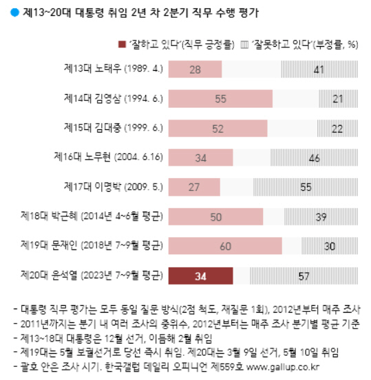 한국갤럽이 22일 공개한 13∼20대 대통령 취임 2년 차 2분기 직무 평가를 보면 윤 대통령(2023년 7∼9월 평균)은 긍정 34%, 부정 57%다. 직전 분기(4∼6월)와 비교하면 긍정은 1%포인트 올라갔고, 부정은 1%포인트 줄었다. 1년차 4분기(긍정 34%, 부정 57%)부터 긍정유느 30% 초중반, 부정은 50% 후반대가 유지되고 있다.