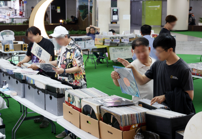 강원 춘천시 지하상가 만남의광장에서 24일 열린 ‘레코드 플리마켓’ 행사에서 시민들이 옛 추억을 되살리는 LP 음반을 살펴보고 있다. 문화예술대안공간 ‘올훼의땅’의 2023 상설프로젝트인 이날 행사에는 춘천시 도시재생지원센터와 춘천 지하상가 상인회의 지원 속에 8개 업체가 참여했으며, LP 음반뿐 아니라 카세트테이프와 CD 등도 판매됐다.