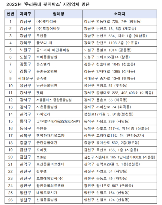 우리동네 펫위탁소는 현재 16개 자치구에 26개소가 지정돼 있다.