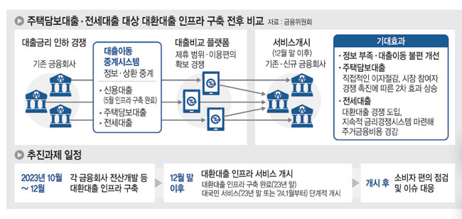 ◇아파트 주담대 대환대출부터 = 대환대출 플랫폼은 은행이나 저축은행, 카드사 등에서 받은 대출을 온라인으로 비교해 보다 낮은 금리의 대출로 갈아탈 수 있게 하는 시스템으로, 금융당국은 지난 5월부터 개인 신용대출을 대상으로 가동을 시작하게 했다. 온라인 대환대출 시스템이 가동되면 스마트폰 앱을 통해 여러 금융회사 대출 조건을 손쉽게 비교해 갈아탈 수 있게 된다.