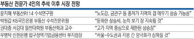 추석 이후 부동산 시장 향방에 대해 전문가들은 수도권 시장의 전반적인 상승률이 둔화하는 가운데 지역별로 눈에 띄는 오름폭이 나타날 수 있다고 예상했다. 그동안 회복이 더뎠던 ‘노·도·강’(노원·도봉·강북구), ‘금·관·구’(금천·관악·구로) 등 중저가 지역에서 갭 메우기 장이 나타날 가능성도 제시했다.