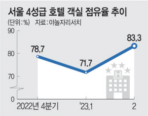 5일 야놀자리서치가 펴낸 ‘국내 숙박업 동향 보고서’에 따르면 지난 2분기 서울 1∼4성급 호텔의 OCC는 평균 80%대를 기록했다. 호텔 OCC가 80%를 유지할 경우 사실상 고객이 모두 입실한 ‘만실’ 상태인 것으로 업계는 보고 있다. 지난 1분기 서울 호텔의 OCC는 71.7%에 그친 바 있다. 호텔의 평균 객실 단가지수(ADR)도 3분기 125.8로 2분기(121.4) 대비 상승했다. 지수가 100을 넘으면 호텔 객실 단가가 높아질 것으로 내다본 업체가 많고, 100 미만이면 반대로 예측한 업체가 많음을 뜻한다.