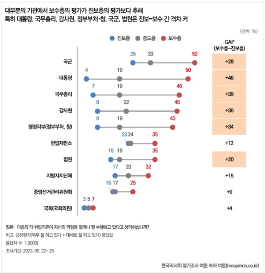 국회는 이념성향과 관계없이 역할을 잘 한다는 응답이 한자릿수에 그쳤다. 진보 3%, 중도 5%, 보수 7%다. 나머지는 헌법기관은 보수층 평가가 진보층보다 후했다. 보수층의 평가와 진보층의 평가가 특히 엇갈린 헌법기관은 대통령(보수층 긍정평가 50%, 진보층 긍정평가 4%,), 국무총리(보수층 46%, 진보층 7%), 감사원(보수층 45%, 진보층 9%), 정부부처·청(보수층 43%, 진보층 9%) 등이다.