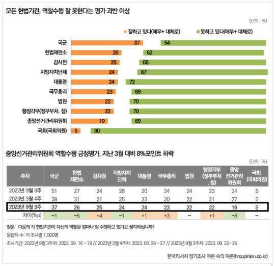 국군을 비롯해 헌법기관은 모두 역할 수행을 제대로 못한다는 평가를 받는 것으로 나타났다. 특히 국회는 긍정 평가가 한 자릿수에 그쳤다. 고위 간부 자녀 특혜 채용 논란이 제기된 중앙선거관리위원회에 대한 평가가 크게 나빠졌다.