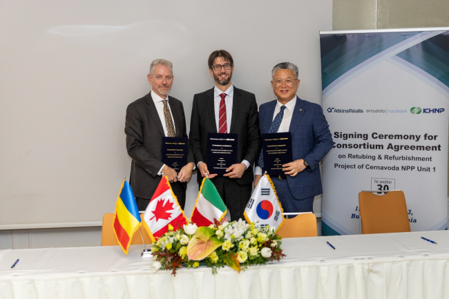 한수원은 12일 루마니아 수도 부쿠레슈티의 루마니아 원자력공사(SNN) 청사에서 캐나다 캔두 에너지, 이탈리아 안살도 뉴클리어와 함께 ‘루마니아 체르나보다 원전 1호기 설비 개선 사업 공동 수행을 위한 컨소시엄 구성’ 협약(사진)을 체결했다고 밝혔다.