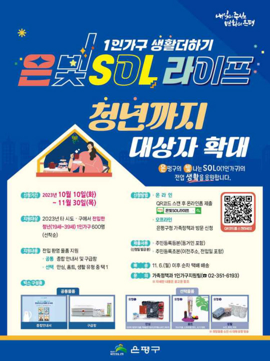 서울 은평구는 1인 가구 전입 생활 지원 사업인 ‘은빛SOL라이프’ 대상을 중장년에서 청년까지 확대한다고 18일 밝혔다.