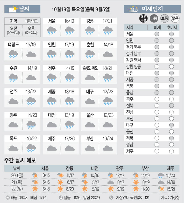 [날씨이야기] 10월19일 목요일(음력 9월5일)