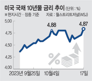 미국 최대 자산운용사인 블랙록은 이날 보고서에서 국채 10년물 금리가 5% 이상 될 수 있다고 내다봤다. 기준금리가 정점에 가까워지고 있는 데다, 투자자들이 만기가 긴 채권에 더 높은 프리미엄을 기대하고 있어 당분간 장기채 금리가 더 오를 가능성이 크다는 것이다. 이날 30년물 국채 금리도 4.93%로 이달 초 기록한 2007년 이후 최고치 수준으로 올랐다. 중동 지역 긴장으로 국채 수요가 늘어나며 안도했던 금융시장은 다시 경계심을 높이고 있다. 미국 경제가 과도한 국채 이자와 발행량으로 글로벌 금융시장을 위기에 빠뜨릴 수 있기 때문이다. 모하메드 엘 에리언 알리안츠 수석 경제고문은 “미국 국채 시장이 극단의 변동성을 나타내며 미지의 영역으로 향하고 있다”고 지적했다.