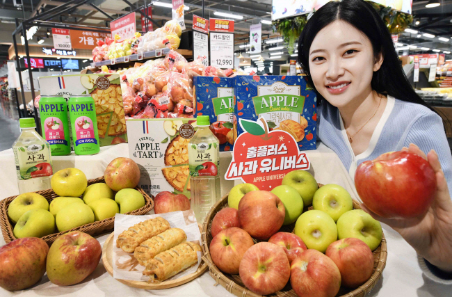 홈플러스가 오는 19일부터 25일까지 감홍과 부사, 홍옥, 양광, 황금사과 5종을 행사 카드로 결제하면 2000원 할인해 주는 ‘사과 유니버스’ 행사를 개최한다고 18일 밝혔다. 사진은 모델이 다양한 사과 및 관련 제품을 진열한 상태에서 포즈를 취하고 있는 모습.