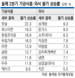 가공식품 세부 품목별 물가 상승률을 보면 잼이 33.7%로 가장 높고 드레싱(32.3%), 치즈(23.0%), 맛살(22.3%) 등 순이었다. 또 라면(12.9%), 발효유(12.6%), 두유(11.6%), 커피(11.5%), 빵(11.4%), 스낵 과자(10.7%), 생수(10.1%) 등은 10% 선을 웃돌았다. 외식은 세부 품목 39개 모두 물가가 올랐다. 햄버거 물가는 12.3% 올랐고 피자도 11.9% 상승했다. 김밥(9.6%), 삼계탕(9.3%), 라면(외식·9.2%), 돈가스(9.0%), 떡볶이(8.7%), 자장면(7.9%) 등도 높은 편이었다. 한국소비자원 가격정보종합 포털 참가격을 보면 지난달 서울 지역 자장면 한 그릇 가격은 7069원으로 처음 7000원 선을 돌파했다.