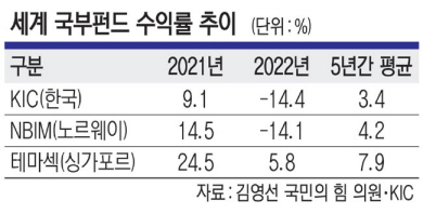 유능한 인재들의 ‘엑소더스(탈출)’로 업무 연속성이 떨어지고, 장기적인 자산 운용이 힘들어진 탓에 KIC의 수익률은 급전직하하고 있다. 지난해 KIC의 수익률(-14.4%)은 싱가포르 테마섹(5.8%)과 아랍에미리트(UAE) 무바달라(-3.1%)·노르웨이 NBIM(-14.1%) 등 세계 국부펀드와 견줬을 때 최하위 수준을 보였다. 코로나19 팬데믹(세계적 대유행)이 촉발한 유동성 확장으로 투자여건이 좋았던 2021년에도 KIC의 수익률(9.1%)은 테마섹(24.5%)과 NBIM(14.5%)보다 낮은 수준이었다.