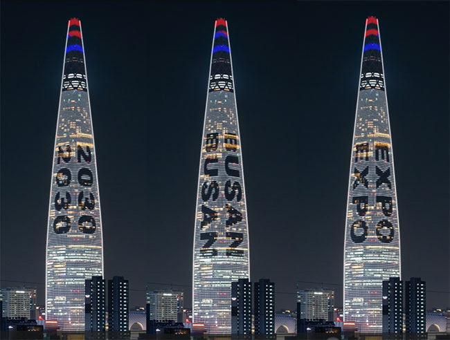 2030 부산세계박람회(엑스포) 개최지를 결정하는 세계박람회기구(BIE) 투표(11월 28일)가 약 한 달 앞으로 다가온 가운데 서울 송파구 롯데월드타워 외벽 미디어파사드에 부산 엑스포 유치를 기원하는 ‘2030 BUSAN EXPO’ 영문 문구가 송출되고 있다. 롯데월드타워를 운영하는 롯데물산은 다음 달 28일까지 일몰 이후 매시 정각마다 10분간 부산 엑스포 유치를 기원하는 문구를 타워 외벽에 송출한다고 30일 밝혔다.