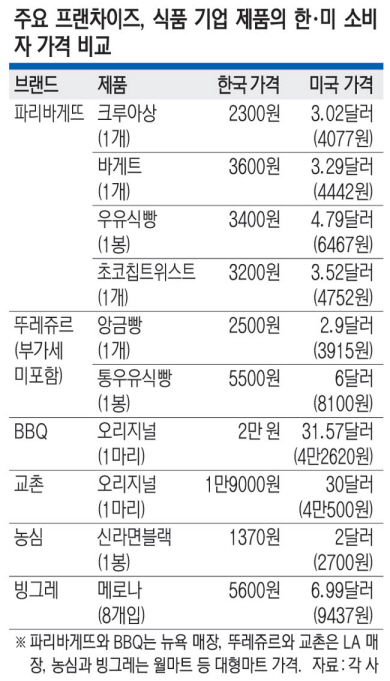 1일 문화일보가 파리바게뜨·뚜레쥬르·BBQ·교촌·농심·빙그레 등 국내 식품·프랜차이즈 기업들의 한국과 미국 제품 판매 가격을 분석한 결과 최대 두 배 이상 차이가 나는 것으로 나타났다. 파리바게뜨가 판매하는 ‘크루아상’의 경우 우리나라에서는 2300원에 판매하고 있지만, 미국 뉴욕 매장에서는 4077원(1달러 1350원 기준)에 판매되고 있었다.