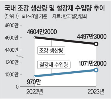 1일 한국철강협회에 따르면 올해 1∼8월 국내 조강 생산량은 4497만3000t으로 전년 동기(4604만2000t) 대비 2.3% 감소했다. 포스코 포항제철소가 지난해 태풍 힌남노 피해로 인한 생산 중단 물량을 올해 상반기에 집중적으로 생산했는데도 경기 불황, 건설업 침체 등 글로벌 수요가 줄어들며 생산이 위축됐다. 반면 중국 내수 부진에 따른 중국산 철강재의 국내 유입 확대, 엔화 약세에 따른 일본 철강재 수입 증가 등으로 인해 올해 8월까지 철강재 수입량은 1071만2000t으로 전년 동기(970만t) 대비 10.5% 증가했다.