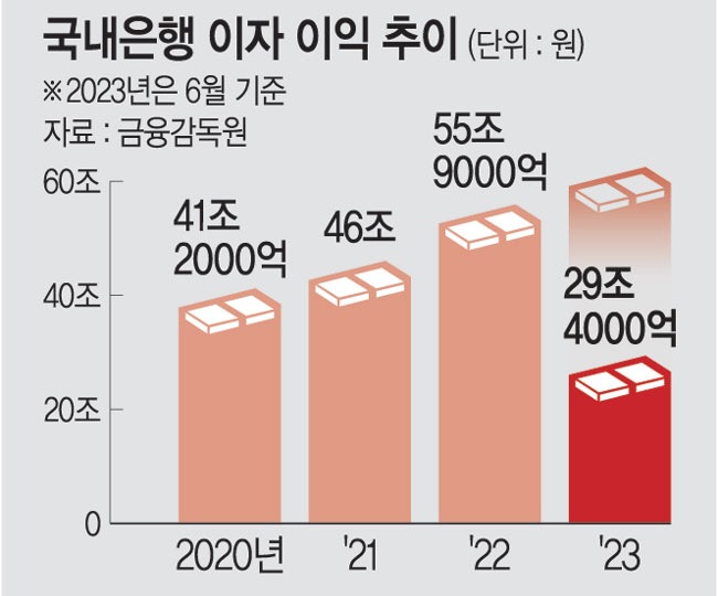 국내 은행들은 상반기에 이자수익으로만 사상 최대규모인 29조4000억 원을 벌어들였다. 정부의 이자장사 경고에도 불구하고 지난 2020년 41조2000억 원이었던 이자 수익은 2021년 46조 원, 2022년 55조9000억 원으로 해마다 늘었다. 은행들이 영업을 잘해 호실적을 이어갔다기보다는, 고금리 상황 속에서 손쉬운 ‘이자장사’로 수익을 올렸다는 비판이 나오는 대목이다.