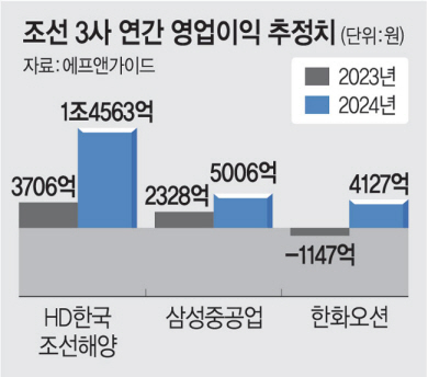 올해 3분기에 2012년 4분기 이후 처음으로 분기 기준 동반 흑자에 성공한 조선 3사는 내년 흑자 폭을 확대할 전망이다. 2021년 상반기까지 수주한 저가 물량을 올해 중 대부분 인도하고 내년부터는 본격적으로 고부가·친환경 선박 수주에 따른 이익 실현에 나설 수 있기 때문이다. 금융정보업체 에프앤가이드는 HD한국조선해양의 영업이익(추정치)이 올해 3706억 원에서 내년 1조4563억 원으로 293% 증가할 것으로 내다봤다. 같은 기간 삼성중공업은 영업이익이 2328억 원에서 5006억 원으로 115% 늘고, 한화오션은 -1147억 원에서 4127억 원으로 흑자전환 할 것으로 전망했다.