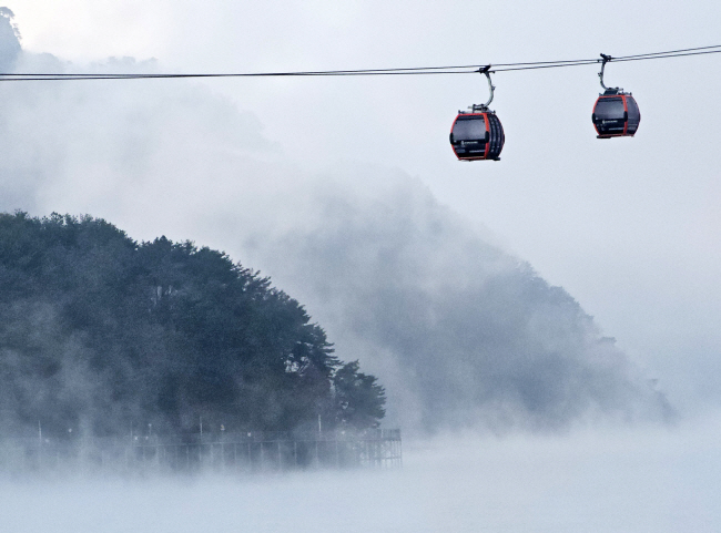 절기상 겨울의 시작을 알리는 입동인 8일 강원 춘천시 의암호에 짙은 물안개가 피어오르고 있다.