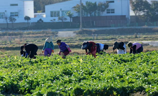 14일 오전 영하의 기온을 보인 강원 강릉시 사천면 한 밭에서 인부들이 무를 수확하느라 바쁘게 손을 놀리고 있다.