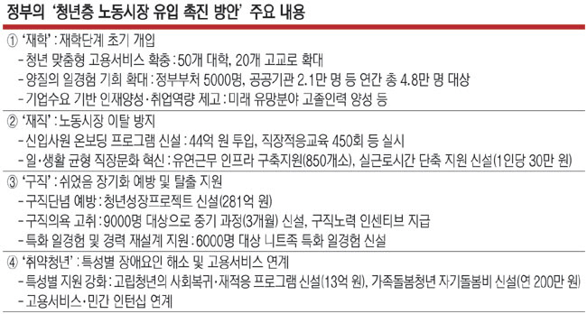 정부가 실업 상태인 이른바 ‘쉬었음’ 청년들을 경제활동 영역으로 이끌어내기 위해 대책을 마련한 데는 이같은 상태가 장기화할 경우 미래 고용 가능성도 더 낮아질 뿐 아니라 국가 전체 잠재성장률 저하로 이어질 수 있다는 우려 때문이다. 10월 취업자 수가 1년 전보다 34만6000명이 늘면서 3개월째 30만 명 이상 증가를 이어가고 있지만 청년층(15~29세)은 12개월 연속 고용이 줄고 있고, 양질의 일자리 수 감소와 평생직장 개념 약화 등 노동시장의 구조적 변화에 청년 고용에 대한 적극적인 정책 대응이 필요하다는 판단도 작용했다.