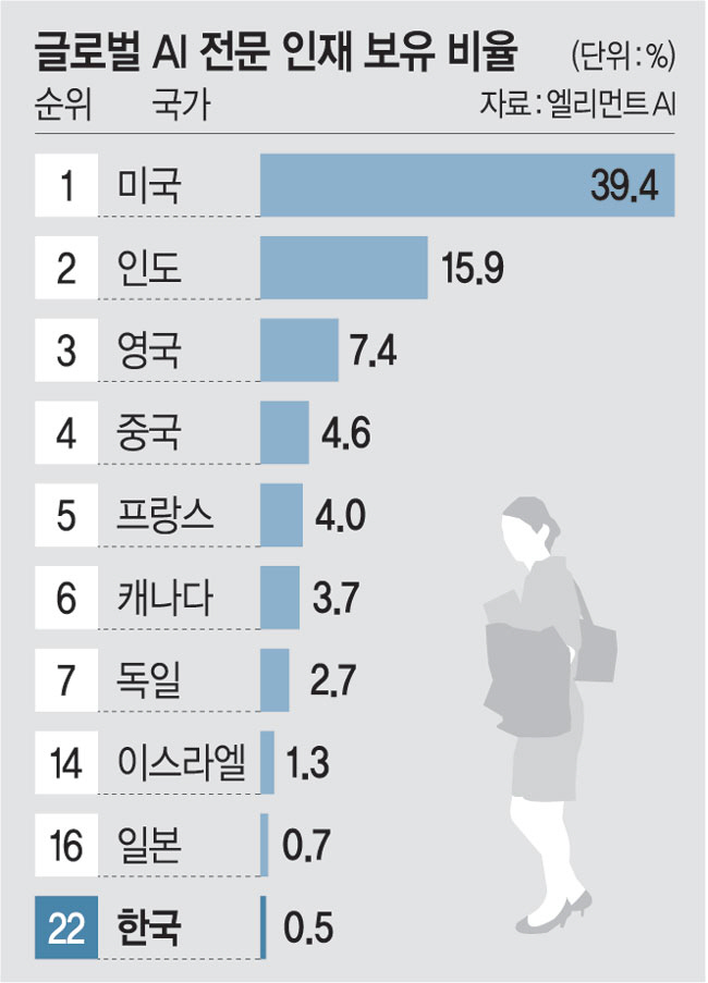 보고서는 AI 전문 연구기관인 엘리먼트 AI가 발표한 ‘2020 글로벌 AI 인재보고’를 인용, 전 세계에서 한국의 AI 인재가 차지하는 비율이 0.5%에 그친다고 분석했다.