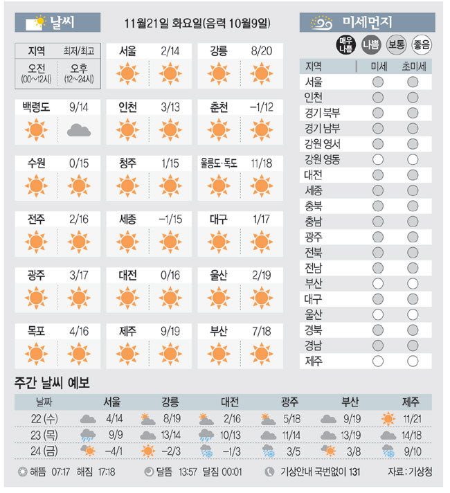[날씨이야기] 11월21일 화요일(음력 10월9일)