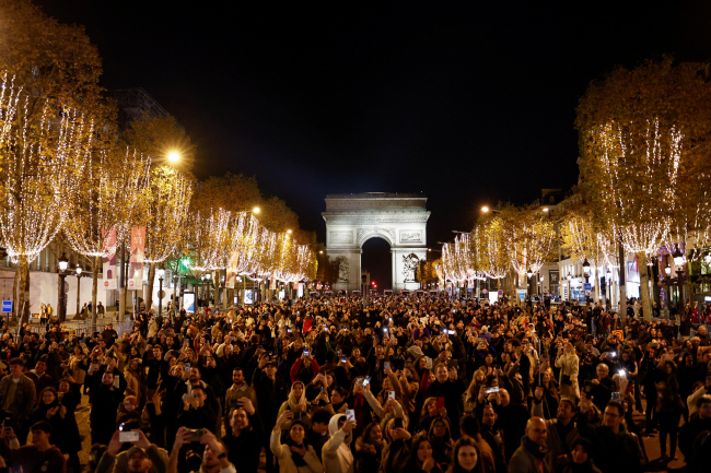 19일 프랑스 파리에서 시민들이 크리스마스를 앞두고 콩코르드광장에서 개선문에 이르는 샹젤리제 대로에 조명이 점등된 광경을 핸드폰으로 찍고 있다.