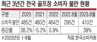 골프장에 대한 소비자 불만 신고는 2020년 485건, 2021년 460건, 지난해 464건, 올해는 8월까지 410건 등으로 해마다 400건 넘게 접수되고 있다. 올해는 지난해 같은 기간(1∼8월) 295건보다 약 39% 증가했다.