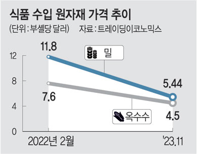 30일 미국 시장조사업체 트레이딩이코노믹스에 따르면 지난 29일 기준 밀 선물 가격은 부셸(27.2㎏)당 5.44달러로 지난 2020년 9월 이후 최저치를 기록했다. 밀 선물 가격은 지난해 2월 러시아·우크라이나 전쟁 이후 부셸당 11.8달러까지 치솟았지만, 이후 빠른 속도로 안정세를 되찾았다. 옥수수 선물 가격도 같은 날 기준 부셸당 4.5달러로 떨어지면서 2020년 12월 이후 가장 낮았다. 식용유로 많이 쓰이는 해바라기유 가격도 연초 t당 1000∼1200달러에서 최근 900달러까지 떨어졌다. 식품기업들이 주로 사용하는 수입 원자재 중 가격이 오르고 있는 품목은 현재 설탕과 코코아뿐이다. 하지만 두 품목은 최근 정부가 관세율 0%인 할당관세 적용을 통해 수입 가격을 낮추기로 해 식품기업들의 부담은 한층 완화될 전망이다.