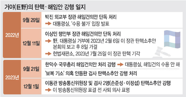 야당의 뜻대로 탄핵소추안이 의결되면 헌법재판소에서 탄핵 여부를 심판하기까지 최장 180일이 걸린다. 이 기간 이 위원장은 사직하고 싶어도 할 수 없어 야권이 국회 본회의에서 탄핵안 표결을 하기 전에 윤 대통령이 사직을 처리할 것이란 관측이 나온다. 여권 핵심 관계자는 “향후 방통위원으로 야당 몫 2명, 여당 몫 1명이 더 들어가게 돼 있다”며 “이렇게 해서 위원장 포함 총 5명으로 방통위가 꾸려지는데, 만약 이 위원장의 발이 묶이면 향후 여야 추천 위원 2대2로 회의가 진행되고, 이러면 방송 정상화 작업은 힘들어질 수밖에 없다”고 설명했다.