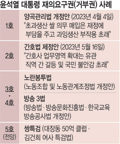 윤석열 대통령은 1일 더불어민주당 주도로 국회를 통과한 이른바 ‘노란봉투법’(노동조합 및 노동관계조정법 개정안) 및 ‘방송 3법’(방송법·방송문화진흥법·한국교육방송공사법 개정안)에 대해 재의요구권(거부권)을 행사할 방침인 것으로 전해졌다. 대통령실은 노란봉투법은 위헌적이며, 방송 3법 역시 공영방송의 독립성·중립성을 정면으로 해칠 수 있다고 보고 거부권 행사가 불가피하다고 판단했다. 야당의 이동관 방송통신위원장 등에 대한 탄핵소추안 처리 추진과 맞물려 예산안 처리, 개각 후 인사청문회를 앞둔 연말 정국이 ‘급랭 국면’으로 접어들 것으로 보인다.