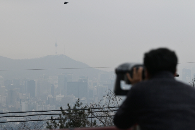 전국 대부분 지역의 초미세먼지 농도가 ‘나쁨’ 수준까지 치솟은 6일 오전 서울 성북구 북악팔각정에서 바라본 도심 풍경이 뿌옇다. 이날 수도권·강원 영서·충청권·호남권·영남권·제주권은 ‘나쁨’, 인천·경기 남부·충남·광주·전북·제주권은 늦은 오후에 일시적으로 ‘매우 나쁨’ 수준일 것으로 전망됐다. 7일 미세먼지가 걷힐 것으로 예상되지만, 영남권은 새벽에 일시적으로 ‘나쁨’ 으로 예상된다.