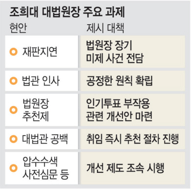 법조계에 따르면, 조 대법원장은 이날 오후 열리는 취임식에서 재판 지연 해결책을 강조할 것으로 알려졌다. 국민이 사법부에 가장 요구하는 점이 신속한 재판이고, 사법부 신뢰를 회복하기 위해서는 재판 지연 문제가 반드시 해결돼야 한다는 것이다. 조 대법원장은 재판 지연 해결책 중 하나로 법원장의 장기 지연 사건 전담 등 전향적 방안을 제시하고 있다. 그는 지난 5일 열린 국회 인사청문회에서 “취임하면 우선 장기미제 사건을 특별히 집중적으로 관리하겠다”면서 “종전에 법원장은 재판하지 않았지만, 법원장에게 최우선으로 장기미제 사건의 재판을 담당하게 할 예정”이라고 설명했다.