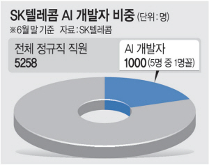 SK텔레콤이 ‘순혈 인공지능(AI) 개발자’를 대거 확보하면서 강도 높은 ‘탈(脫) 통신 전략’을 추진하고 있는 것으로 나타났다. 올해 채용한 신입사원의 절반가량을 개발자가 차지했다. SK텔레콤의 개발자는 현재 1000명 이상으로 전체 직원의 5명 중 1명인 셈이다.