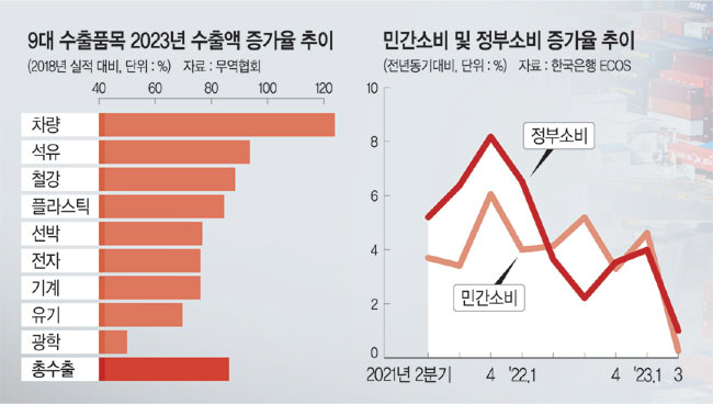 앞으로 우려되는 것은 소비 부진이다. 지난 20여 년 민간소비는 연평균 2∼3%씩 증가해 왔는데 최근 1% 이하로 떨어지고 있다. 정부소비도 매년 4∼5%씩 증가하던 것이 윤석열 정부 들어 빠르게 하락하면서 지난 3분기에는 1%대로 낮아졌다.(오른쪽 [그림] 참조)